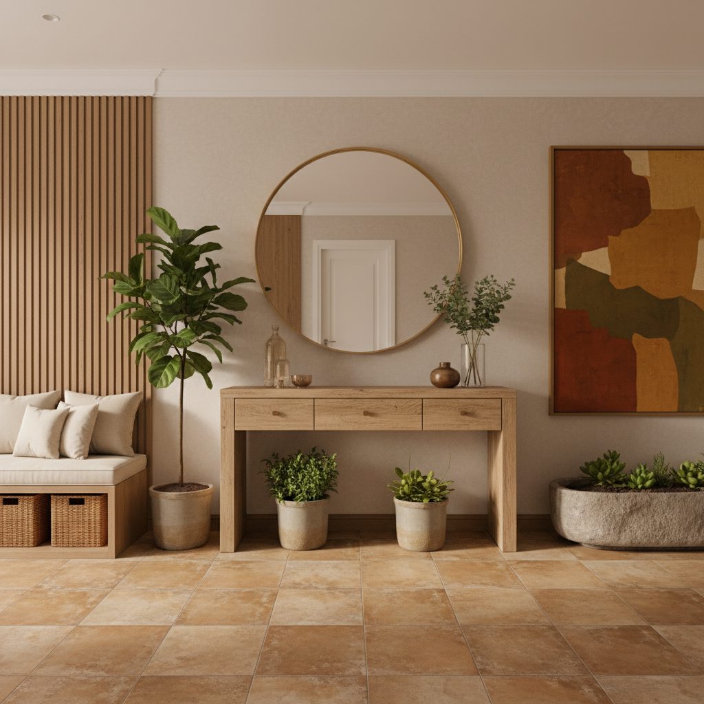 如果您喜欢传统文化的内敛,新中式玄关是不二之选。它往往利用借景或屏风的设计,营造出“若隐若现”的美感。大气的石材背景墙配合木质格栅,再点缀一件精致的艺术品或绿植,瞬间提升空间层次。通过对古典元素的现代化重组,新中式玄关展现出一种内敛而宽广的气度。