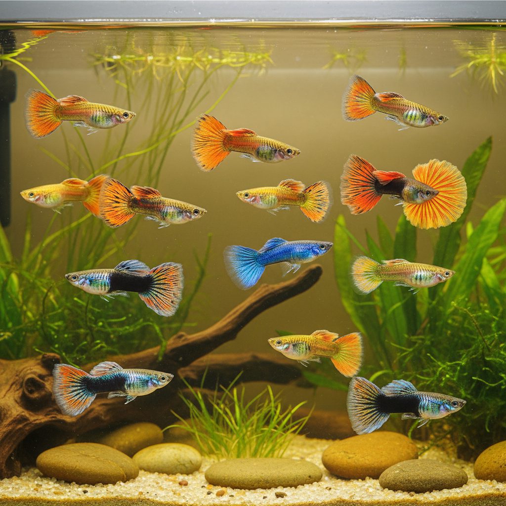 除了常见的扇形大尾,剑尾孔雀鱼以其修长的身形和奇特的尾鳍吸引了目光。这种鱼的尾鳍中央内缩,上下两边或其中一边往后延伸如剑,分为顶剑、底剑及双剑,其中双剑是目前市场上的主流。豹纹孔雀鱼则是从草尾孔雀中分划出来的,起源于德系黄尾礼服,其尾鳍底色多为黄色,吻部也带有黄色特征。值得一提的还有“古老系”孔雀鱼,虽然冠以古老之名,实际上它是一种色彩斑斓如七彩虹的新品种。古老系孔雀鱼的背鳍较高且呈平行四边形,胸鳍附近有黑色斑纹,尾鳍则以深蓝色为基调,带有多色斑点,看起来像是模糊的马赛克纹路。综上所述,孔雀鱼的十个主要漂亮品种各具特色,无论你追求的是简约的纯色还是复杂的纹理,都能在这些品种中找到心头所好。
